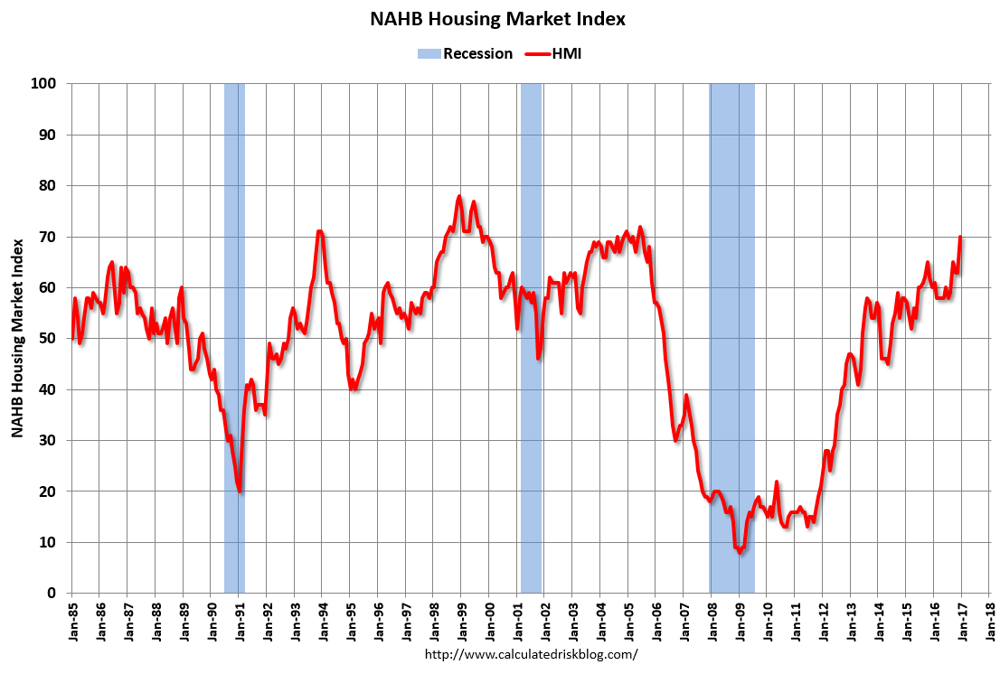 The National Association of Home Builders (NAHB) reported the housing market index (HMI) was at 70 in December, up from 63 in November. Any number above 50 indicates that more builders view sales conditions as good than poor.
